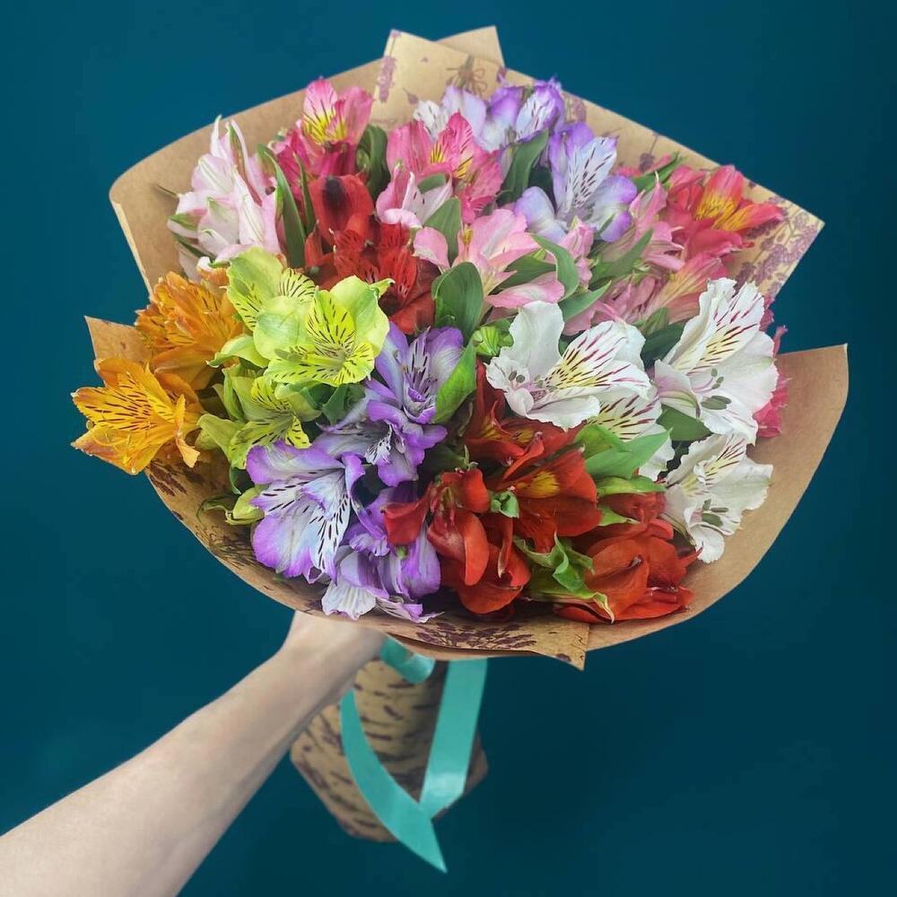 Лента атласная – 1 шт.Крафт упаковка – 1 шт.альстромерия микс – 21 шт.