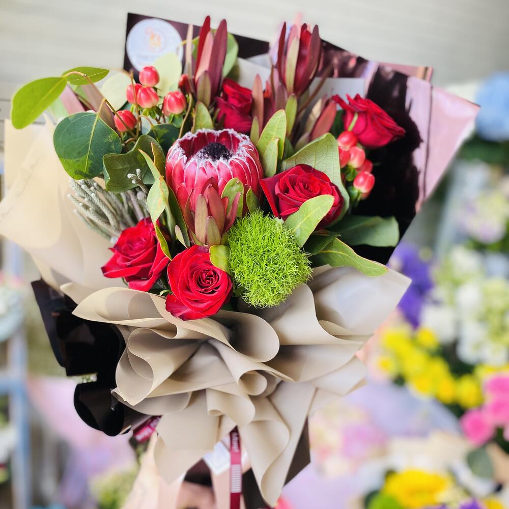 Протея – 1 шт. грін тік – 1 шт. хіперикум – 2 шт. брунія – 2 шт. леукадетрон – 2 шт. червона троянда – 3 шт. евкаліпт – 1 шт.