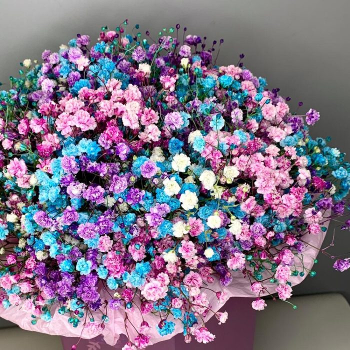 Лента атласная – 2 шт.Тишью – 2 шт.Коробка шляпная – 1 шт.Пленка прозрачная – 1 шт.Оазис флористический – 1 шт.гипсофила радужная – 9 шт.