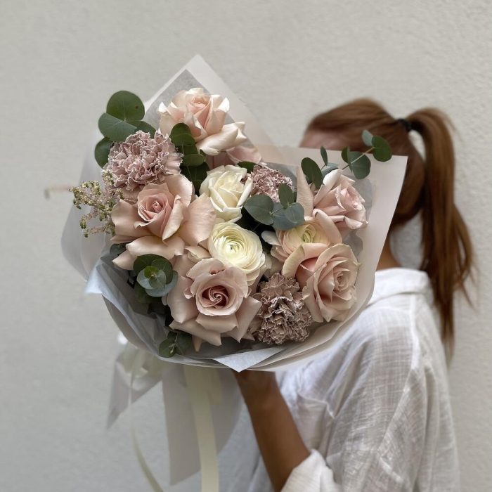 розы – 7 шт. Ранункулюс – 7 шт. Гвоздика – 3 шт. Астильба – 1 шт. Эвкалипт – 2 шт.