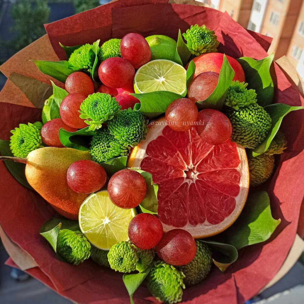 Хризантема Сантини – 3 шт.Лайм – 3 шт.Груша – 1 шт.Грейпфрут – 1 шт.Нектарин – 2 шт.рускус (зелень) – 5 шт.виноград ред глоб – 150 гр.
