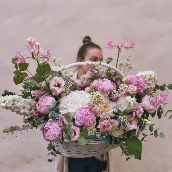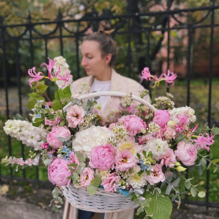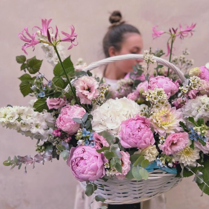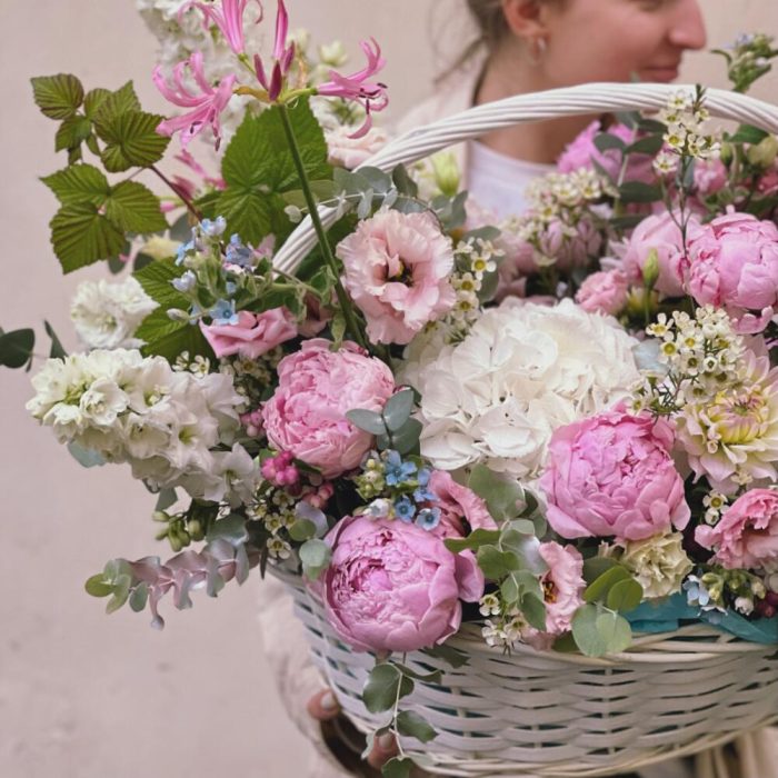 Пион – 15 шт.Гортензия – 3 шт.Дельфиниум – 3 шт.Нерина – 5 шт.Ваксфлауэр – 10 шт.Эустома – 10 шт.Твидия – 10 шт.Корзина – 1 шт.