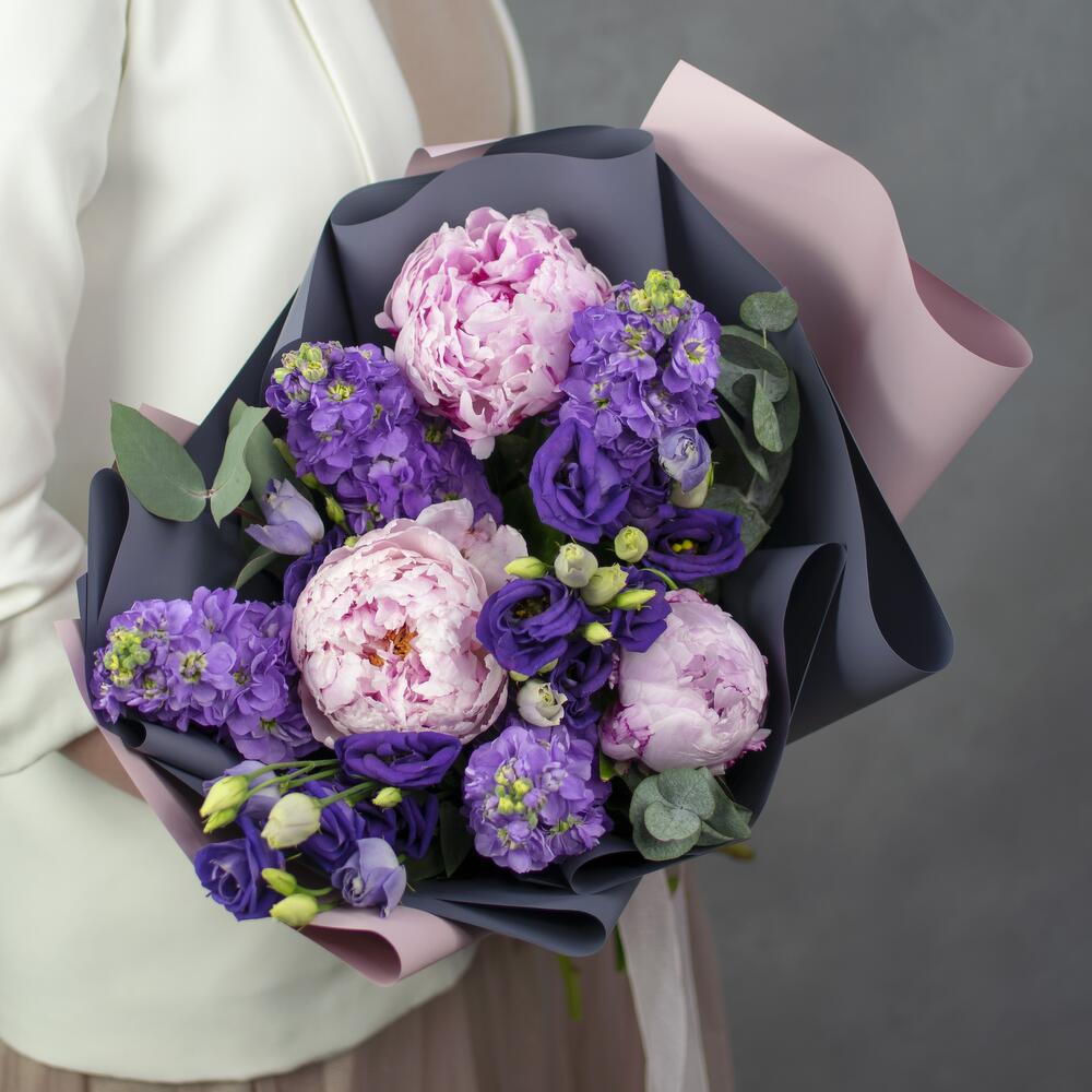 Маттиола – 4 шт.Пион – 3 шт.Фисташка – 4 шт.Лизиантус синий – 3 шт.