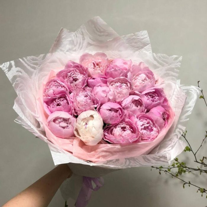 19 розовых пионов в упаковке