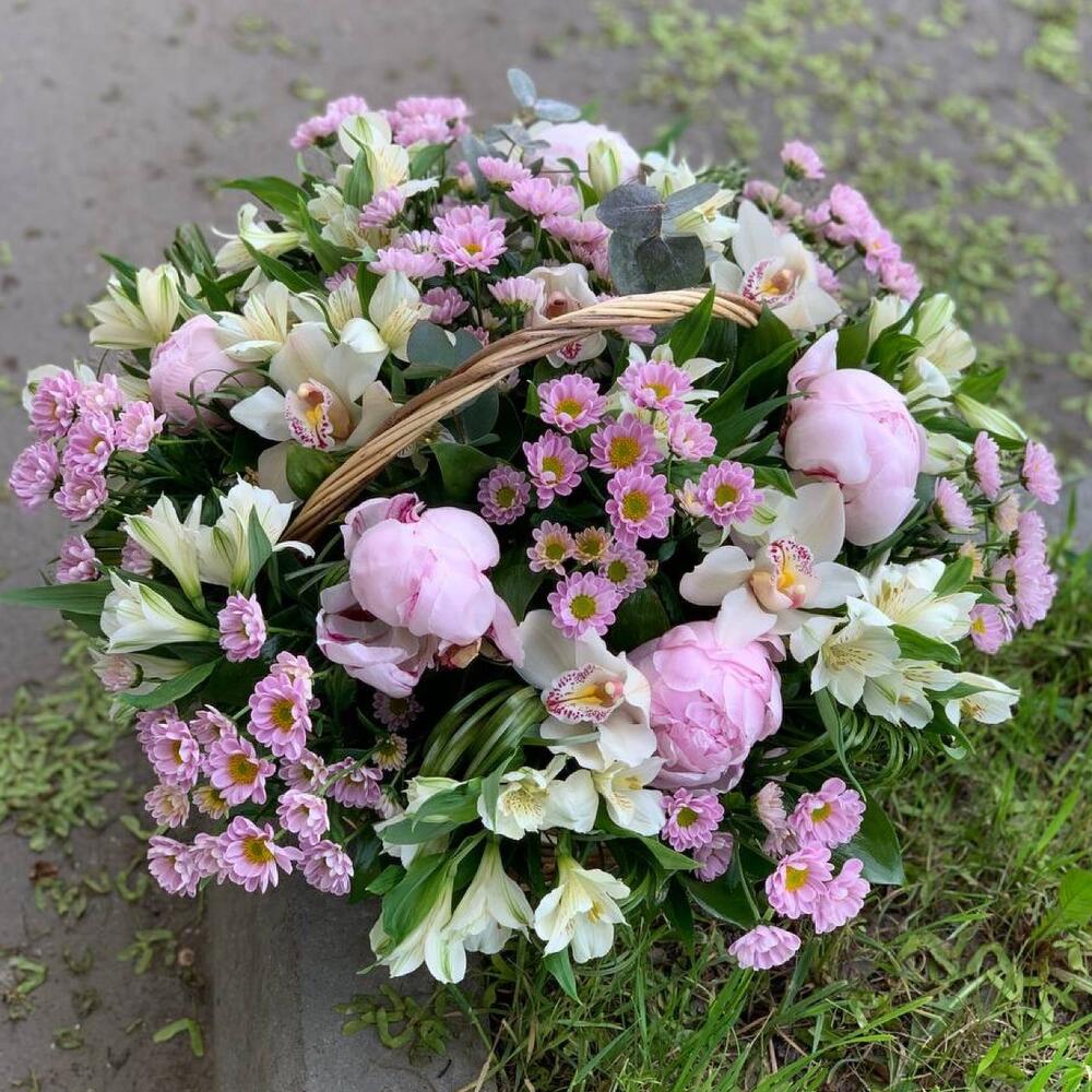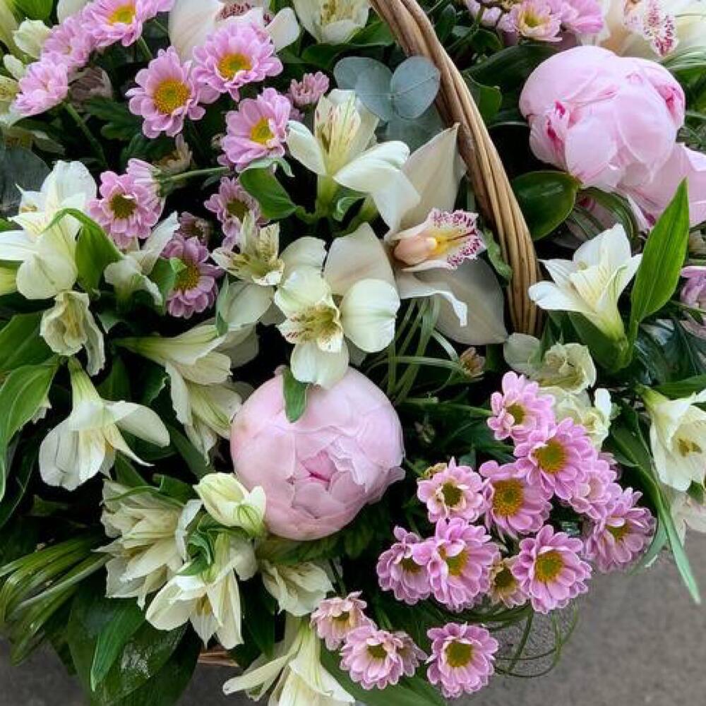 Корзина с пионами, альстромерией и сантини