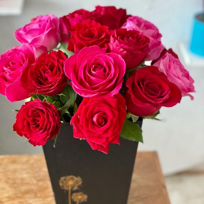 Зелень – 2 шт.Коробка шляпная – 1 шт.Роза одноголовая микс – 25 шт.Губка флористическая – 1 шт.