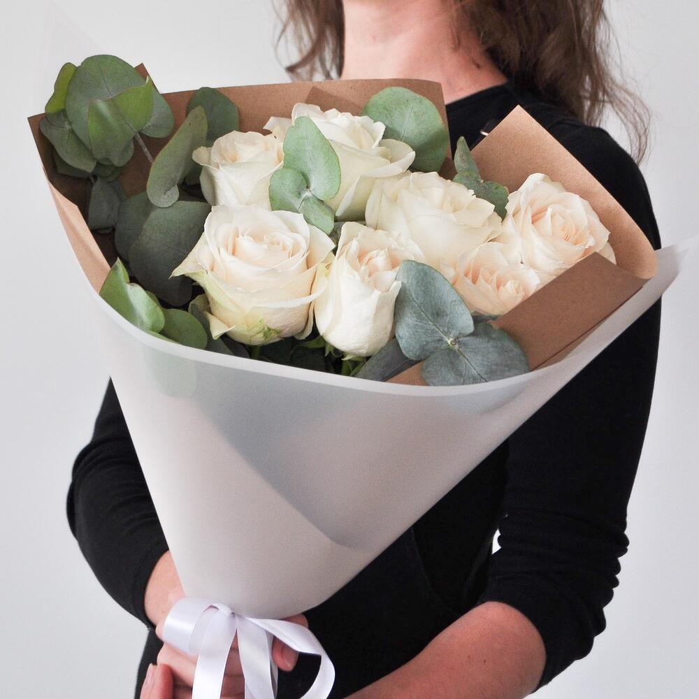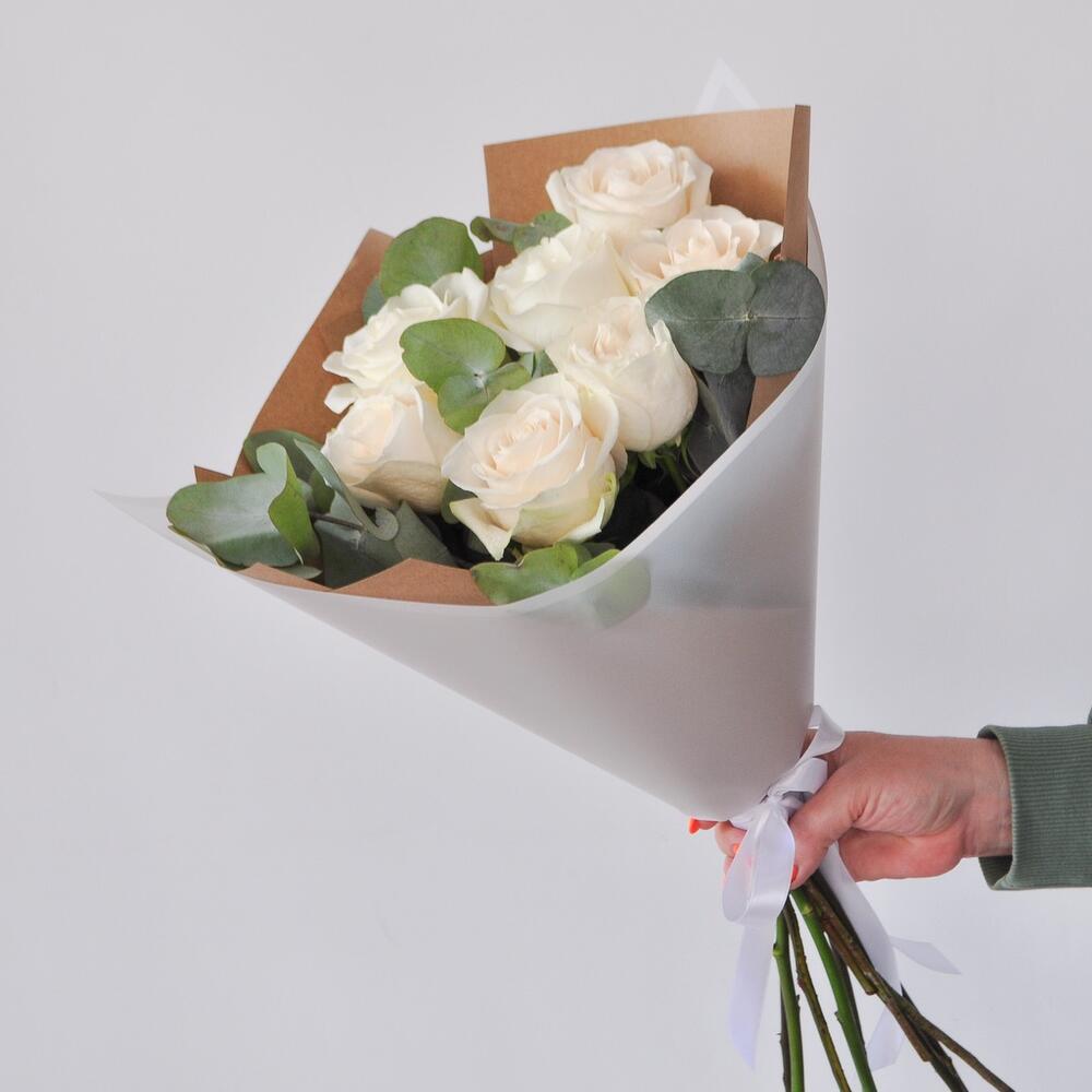 Эвкалипт – 2 шт.Лента атласная – 1 шт.Упаковка дизайнерская – 2 шт.Роза Эквадор 60 см – 7 шт.