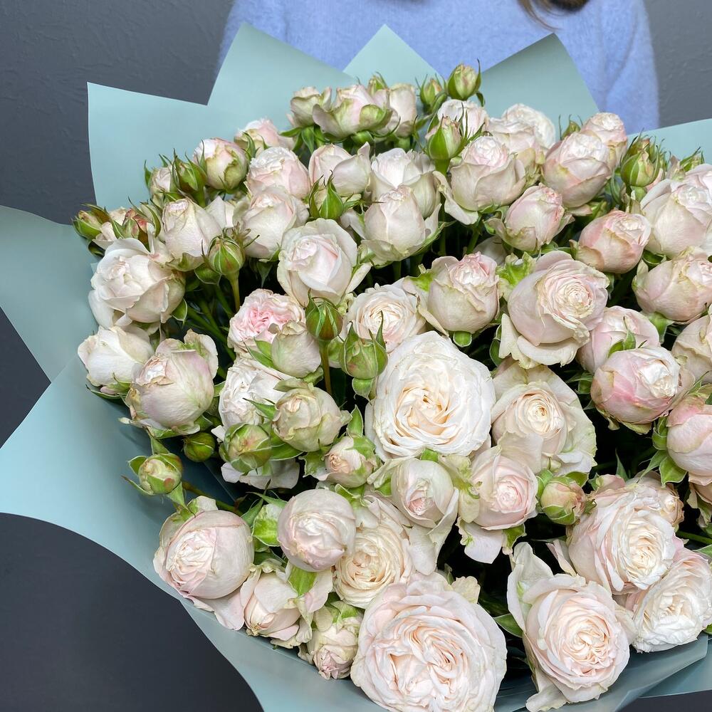 Лента атласная – 1 шт.Упаковка дизайнерская – 6 шт.пионовидная кустовая роза сорта бомбастик – 15 шт.