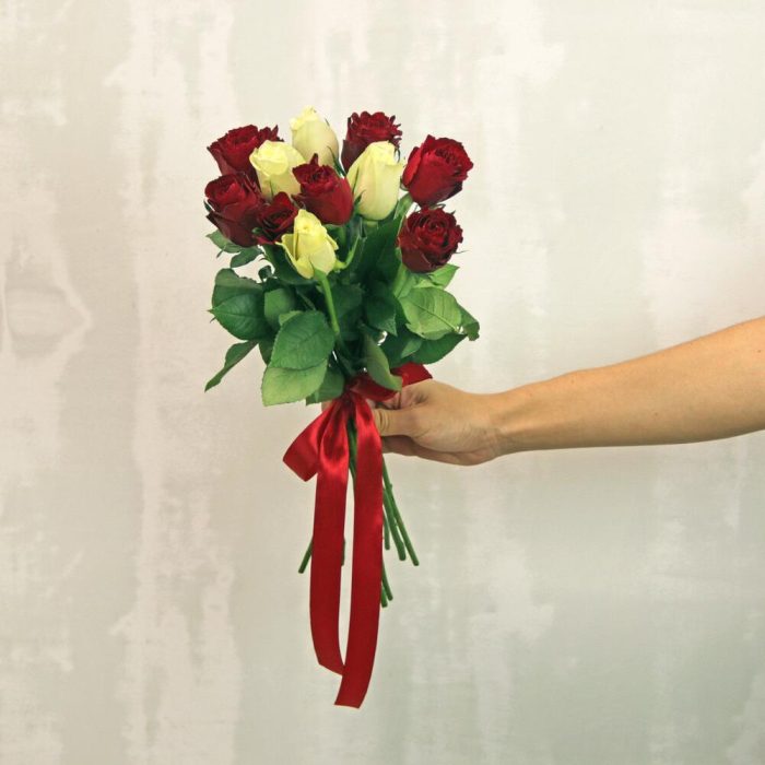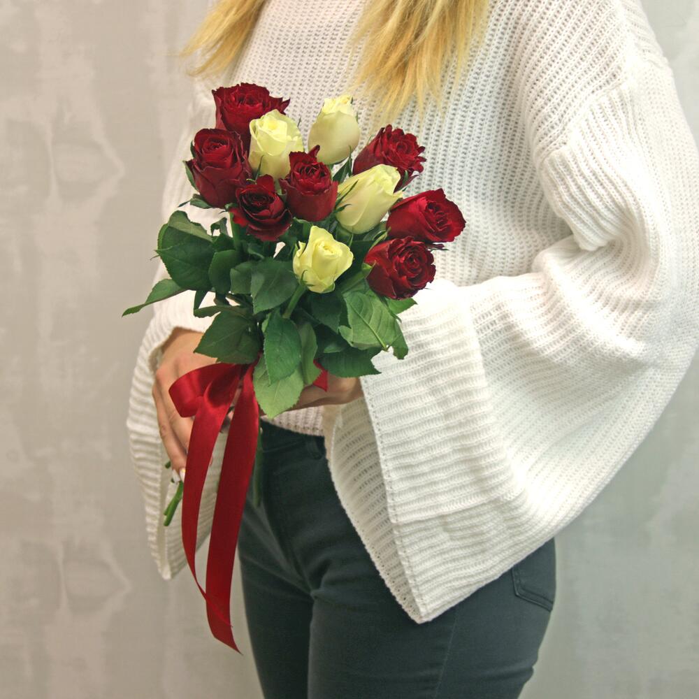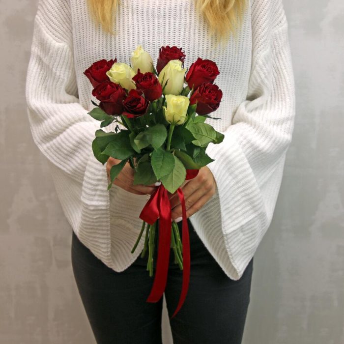 Букет из 11 красных и белых роз микс 35-40 см (Кения) под ленту