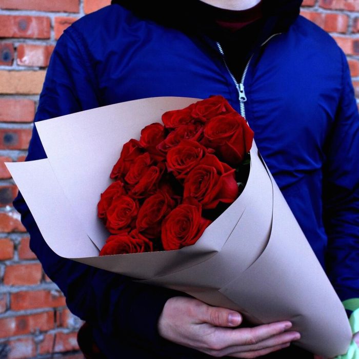 Лента атласная – 1 шт.Красная роза – 15 шт.упаковочный материал – 2 шт.