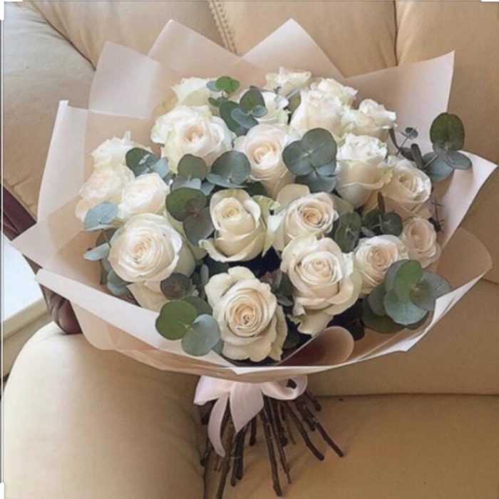 розы – 25 шт.Эвкалипт – 1 шт.Атласная лента – 1 шт.
