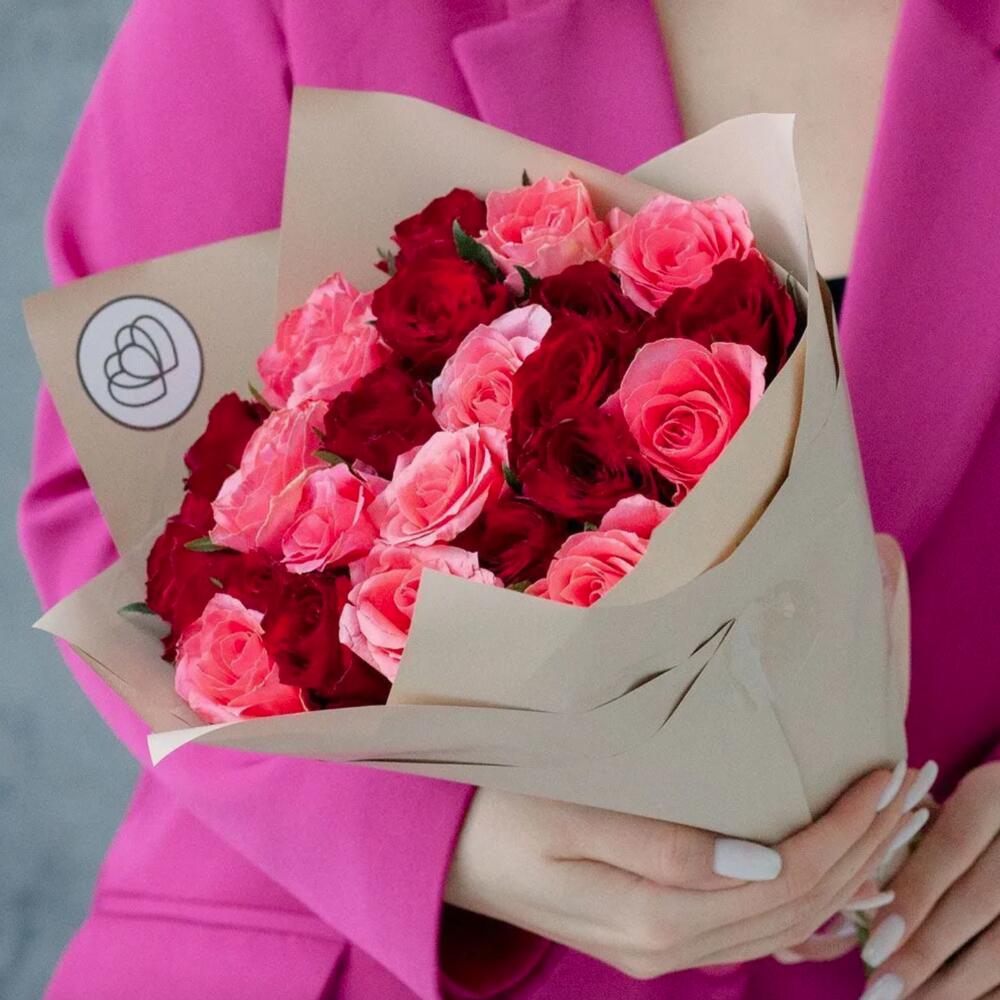 Букет из 25 красных и коралловых роз (Кения) 40 см в кремовой пленке