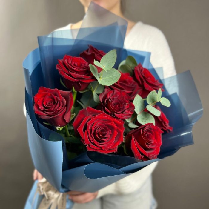 Эвкалипт – 3 шт.Лента атласная – 2 шт.Пленка матовая – 5 шт.Роза эксплорер 50 см – 9 шт.пленка полупрозрачная – 4 шт.