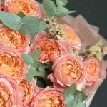 Букет из кустовой пионовидной розы, хамелациум и эвкалипт