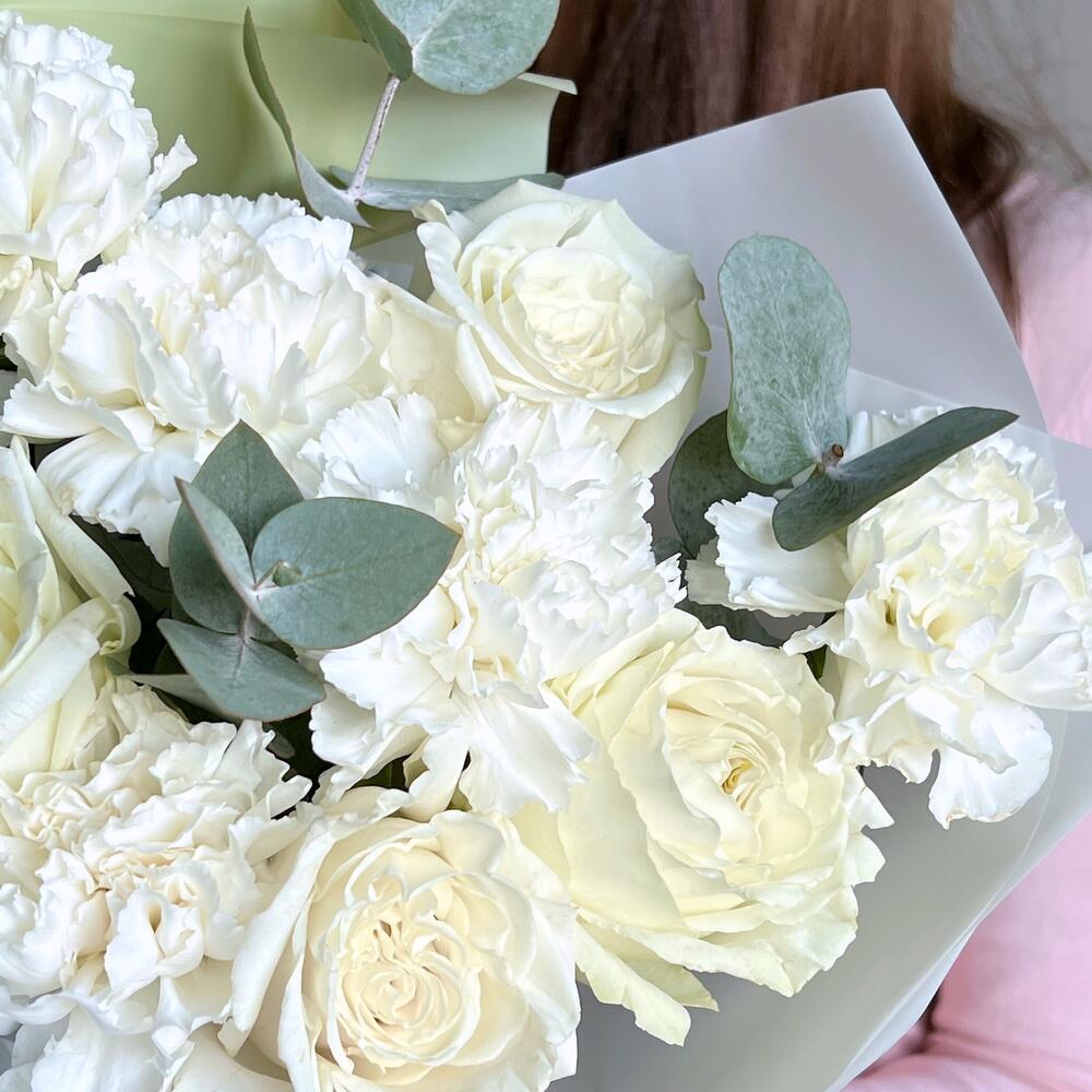Роза Эквадор – 4 шт.Гвоздика – 5 шт.эвкалипт cineria – 2 шт.Дизайнерская упаковка – 1 шт.Лента – 1 шт.