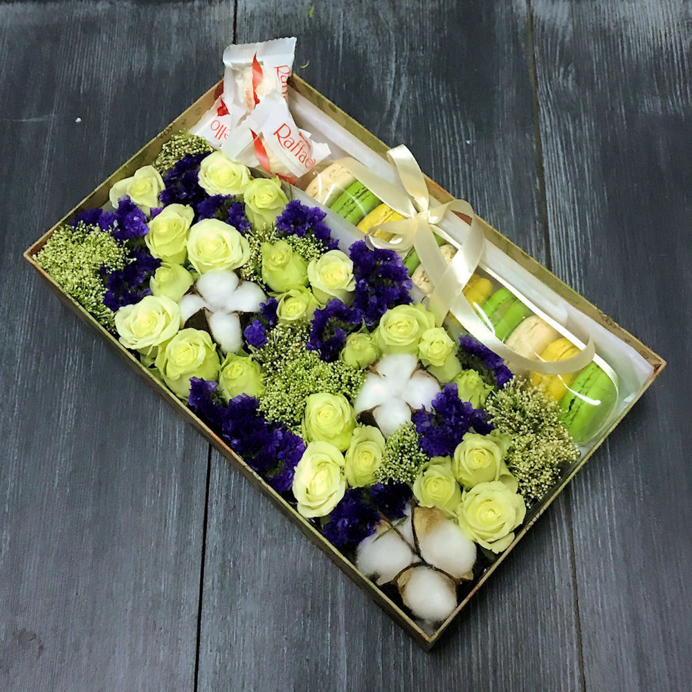 Букет из цветов и макаронс в декоративной коробке "Карамель"
