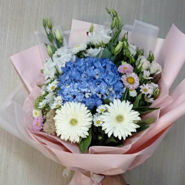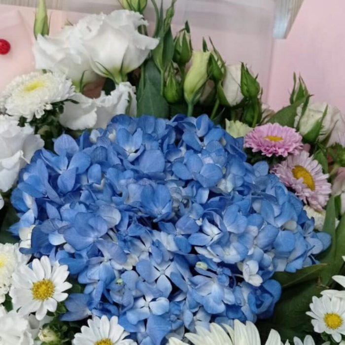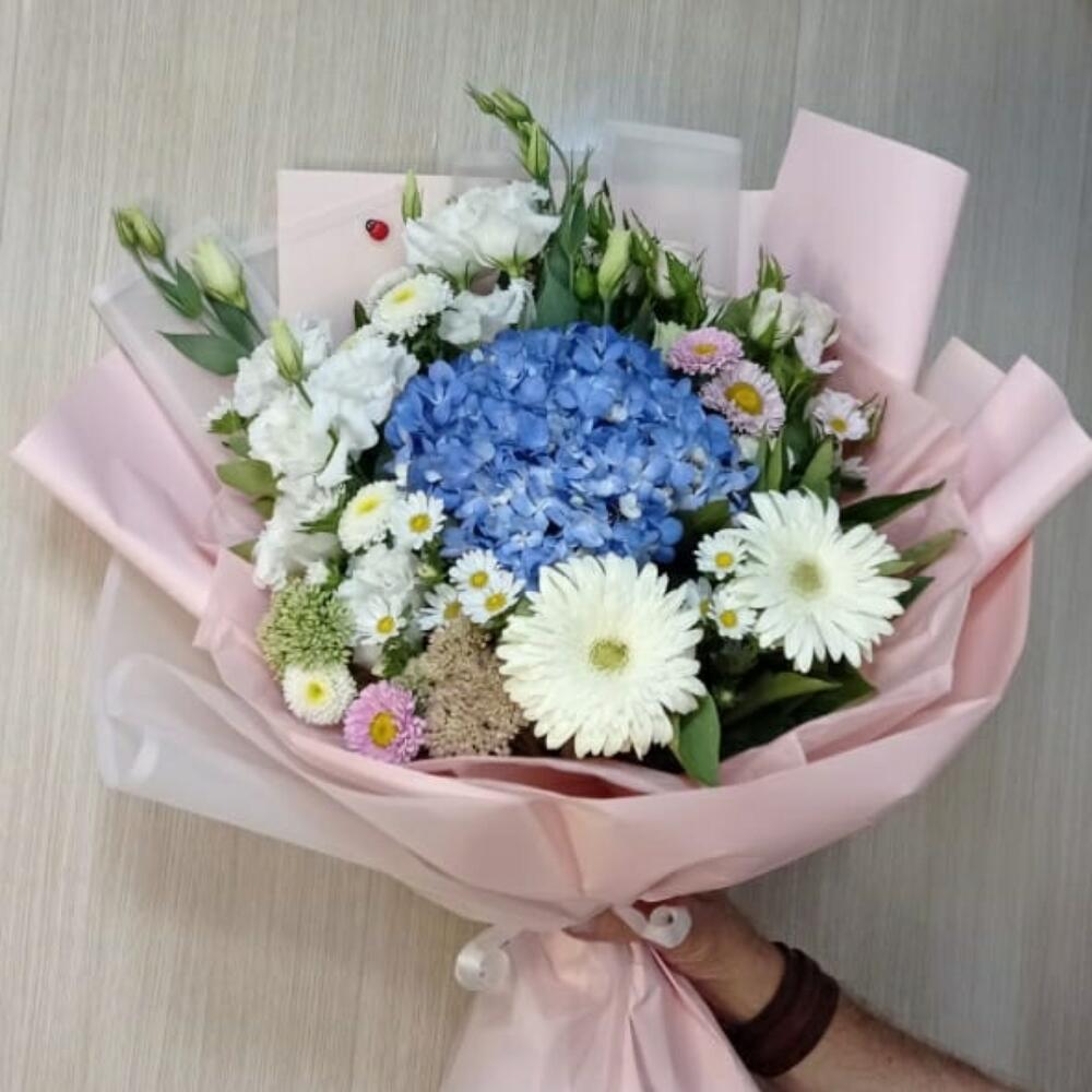 Гортензия голубая – 1 шт. Лизиантус Алиса белый – 3 шт. Гербера белая – 2 шт. Роза кустовая – 2 шт.