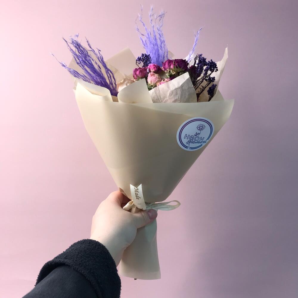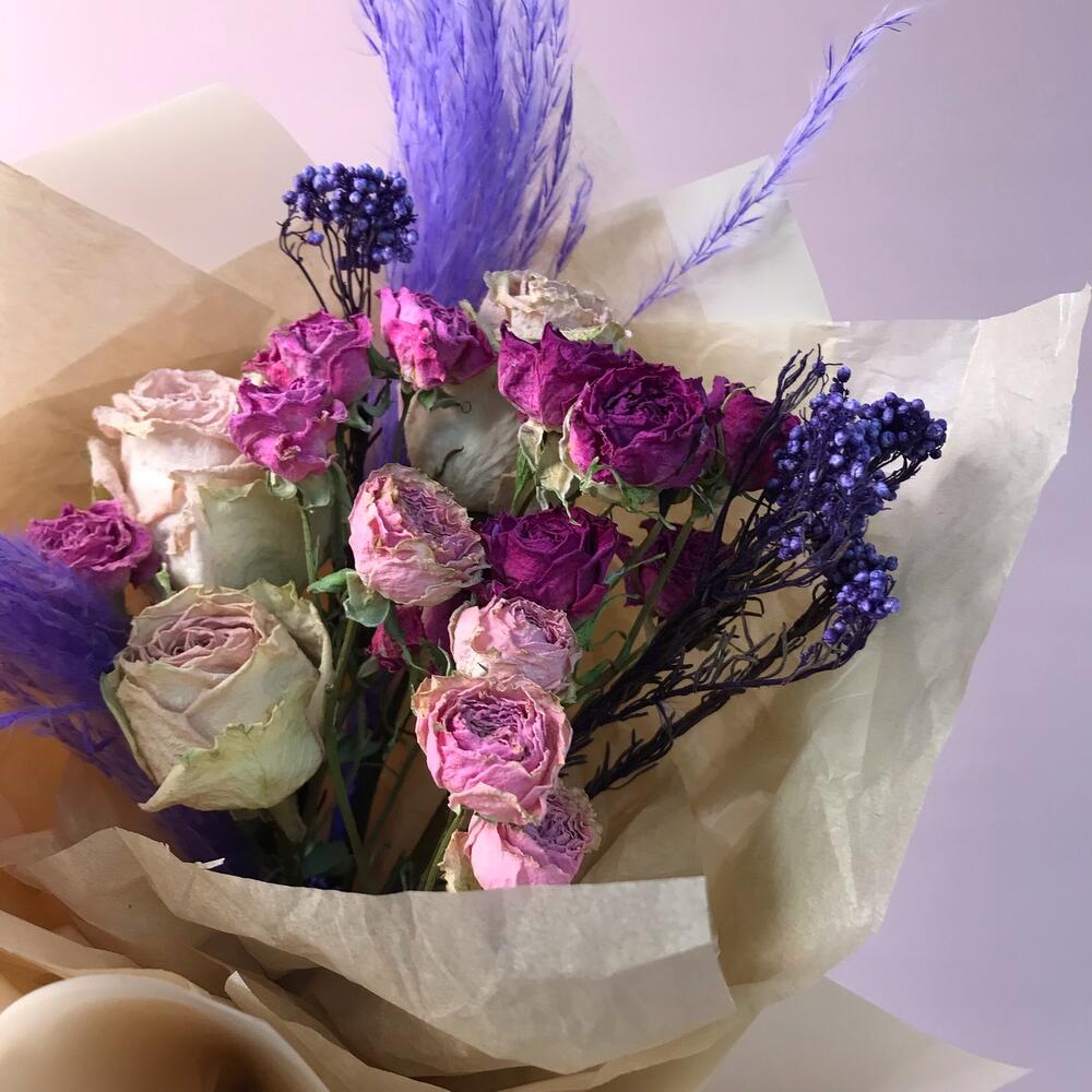 Ковыль – 2 шт.озотамнус стабилизированный – 2 шт.роза кустовая засушенная – 2 шт.роза засушенная – 3 шт.Оформление – 1 шт.