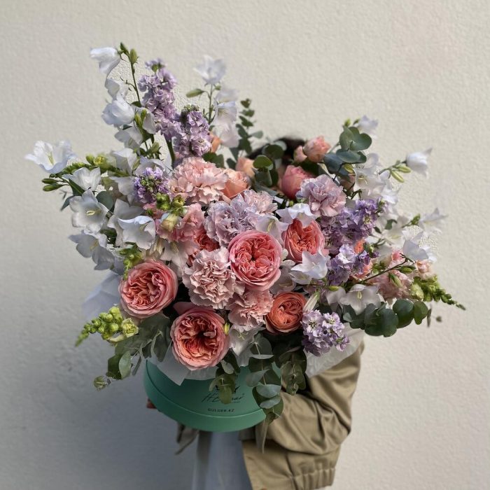 сортовые розы – 9 шт. пионовидные спрей роза – 3 шт. Маттиола – 6 шт. Гвоздика – 6 шт. Львинный зев – 6 шт. Колокольчик – 15 шт. Эвкалипт – 3 шт.