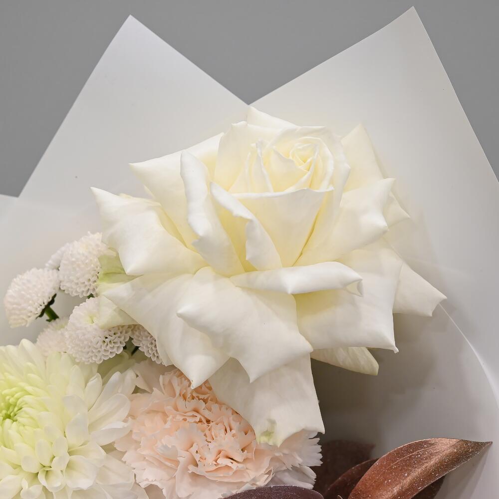 Французская роза – 3 шт.Хризантема – 1 шт.Гвоздика – 2 шт.Сантини – 1 шт.Рускус – 1 шт.Упаковка дизайнерская – 1 шт.