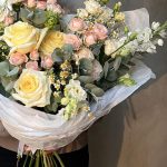 Букет с маттиолой, пионовидной розой, кустовой розой и матрикарией