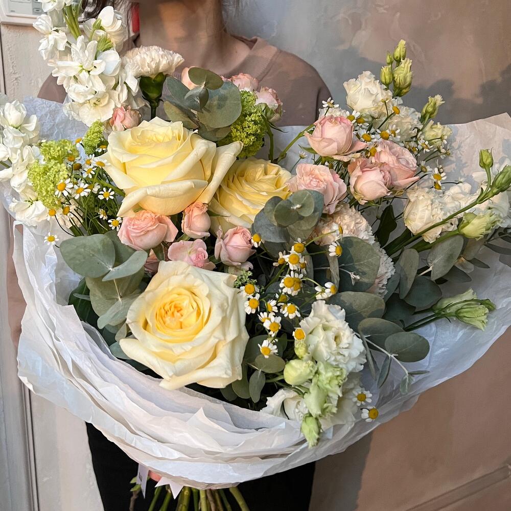 Вибурнум – 2 шт.Лизиантус – 2 шт.Маттиола – 3 шт.Роза кустовая – 3 шт.Эвкалипт – 2 шт.Матрикария – 3 шт.Роза пионовидная – 3 шт.Упаковка дизайнерская – 1 шт.