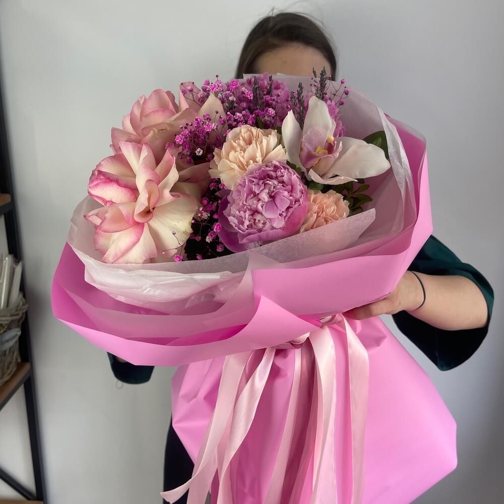 Гипсофила – 1 шт.Лаванда (сухоцвет) – 10 шт.Орхидея Цимбидиум – 1 шт.Пион – 3 шт.Диантус – 2 шт.Салал листья – 4 шт.Роза французская – 2 шт.