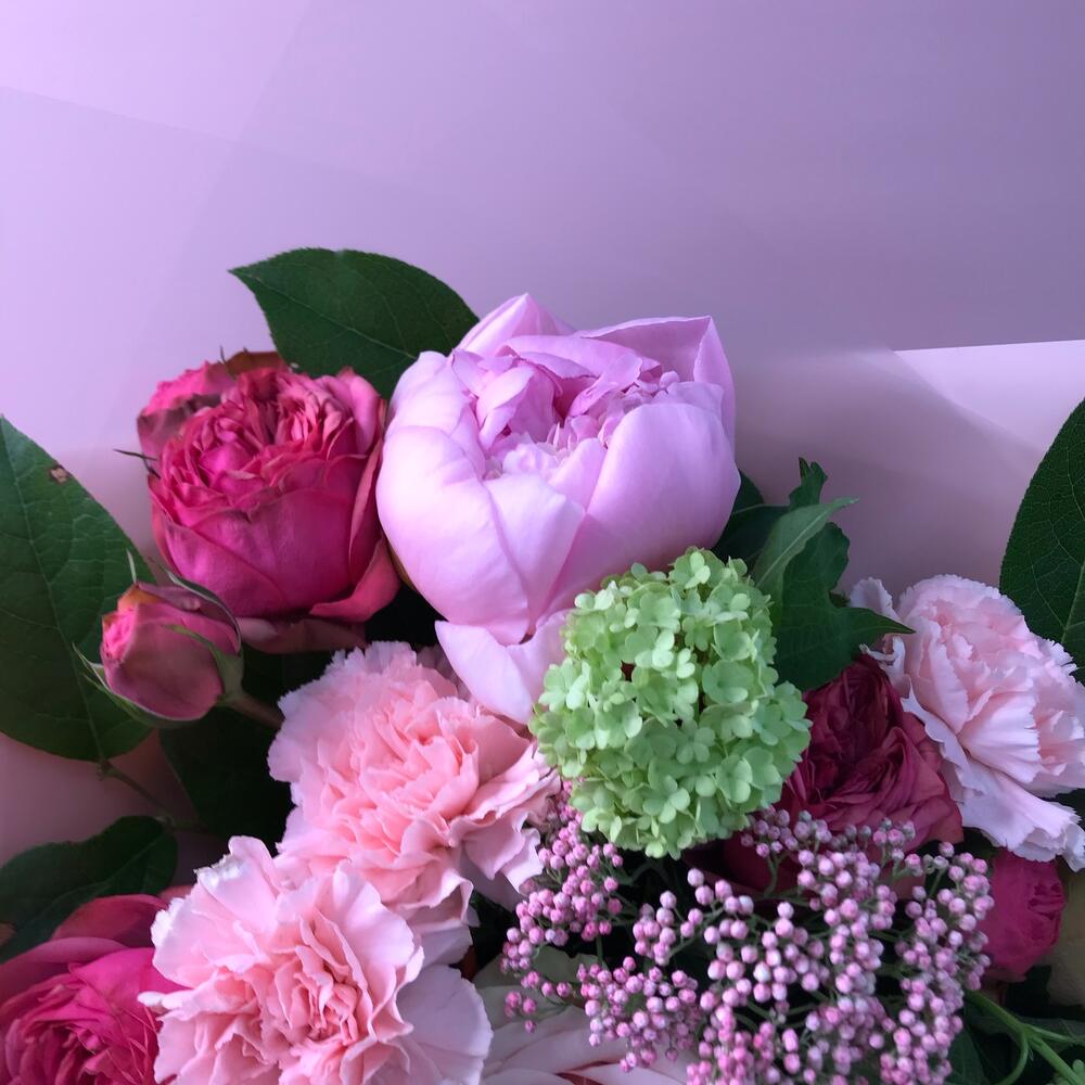 Оформление – 1 шт.Пион – 2 шт.Роза садовая – 3 шт.роза фрутетто – 3 шт.Диантус – 3 шт.Озотамнус – 2 шт.Вибурнум – 1 шт.Салал – 7 шт.