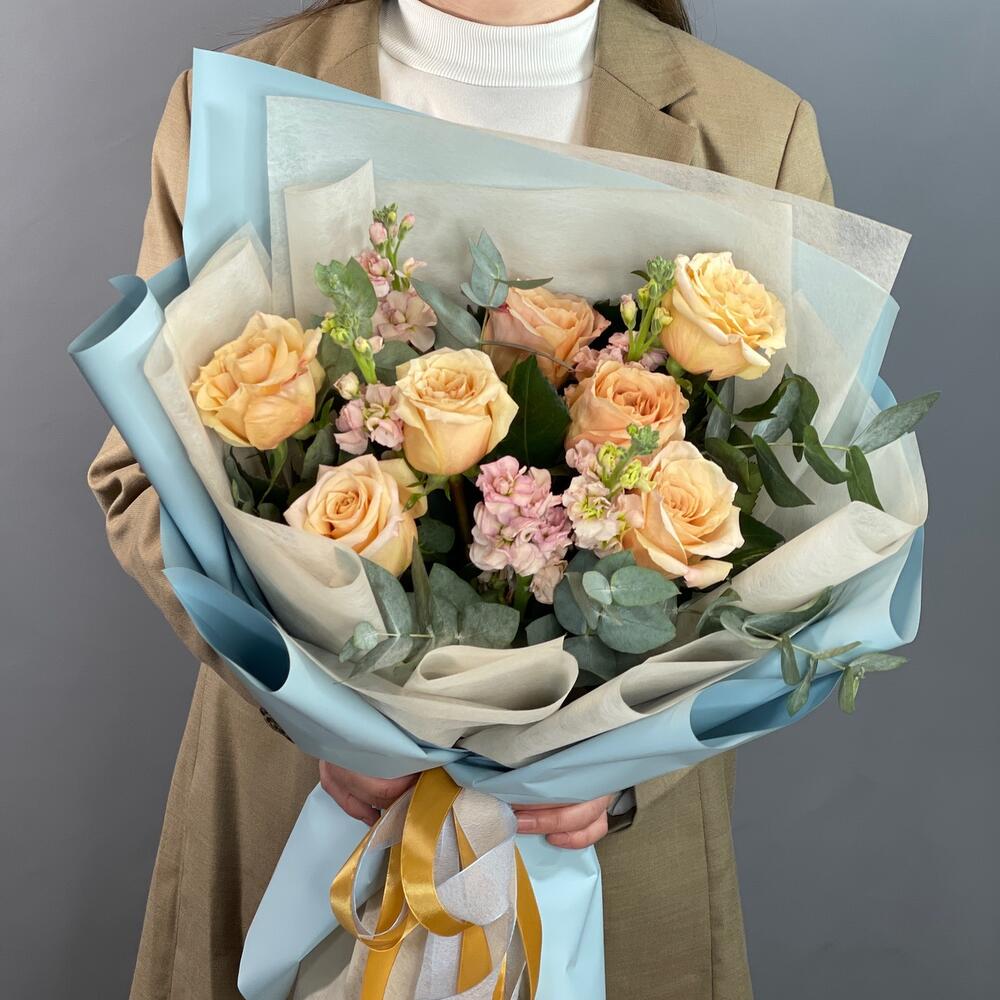 Лента – 1 шт.Маттиола – 5 шт.Эвкалипт – 2 шт.Упаковка – 1 шт.Роза шиммер – 7 шт.