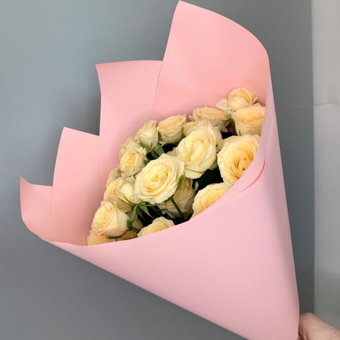 Роза кустовая – 5 шт.Лента атласная – 2 шт.Дизайнерская упаковка – 1 шт.