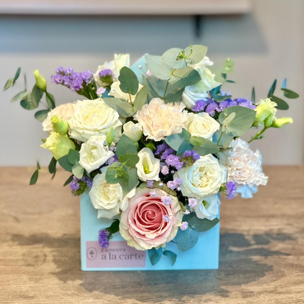 Кашпо конверт деревянный – 1 шт.Оазис флористический – 1 шт.Роза – 1 шт.эустома белая – 2 шт.Эвкалипт – 1 шт.Статица – 1 шт.Гвоздика – 3 шт.