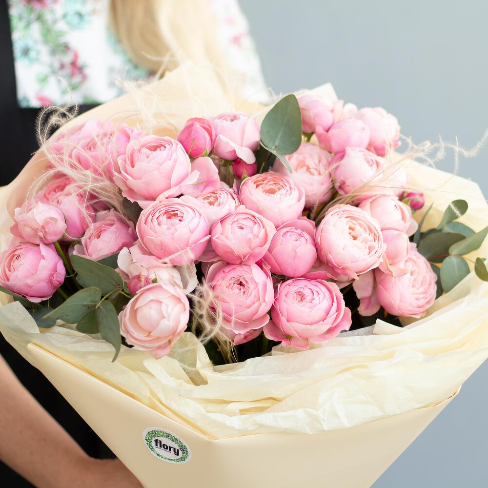 кустовая пионовидная роза сильвия пинк – 10 шт. Стифа – 3 шт. Эвкалипт – 3 шт.