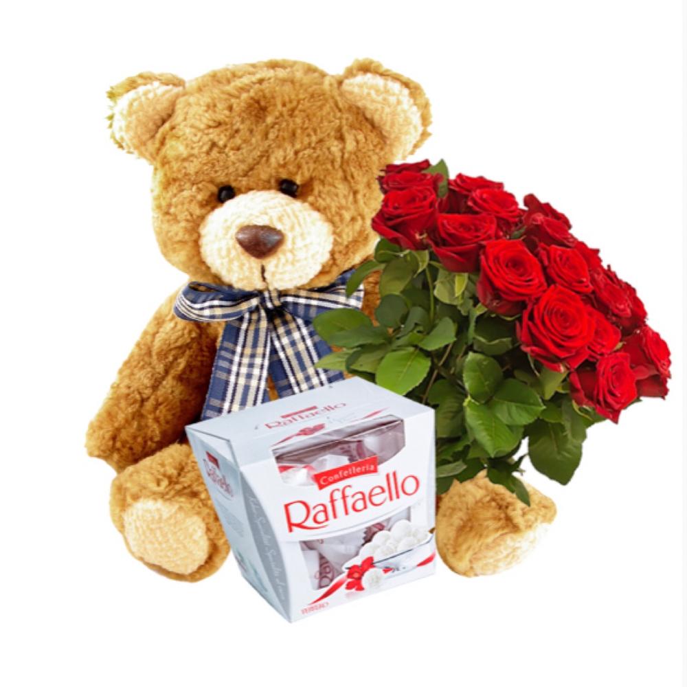 Набор: букет из 25 роз, конфеты Raffaello, плюшевый мишка 35 см