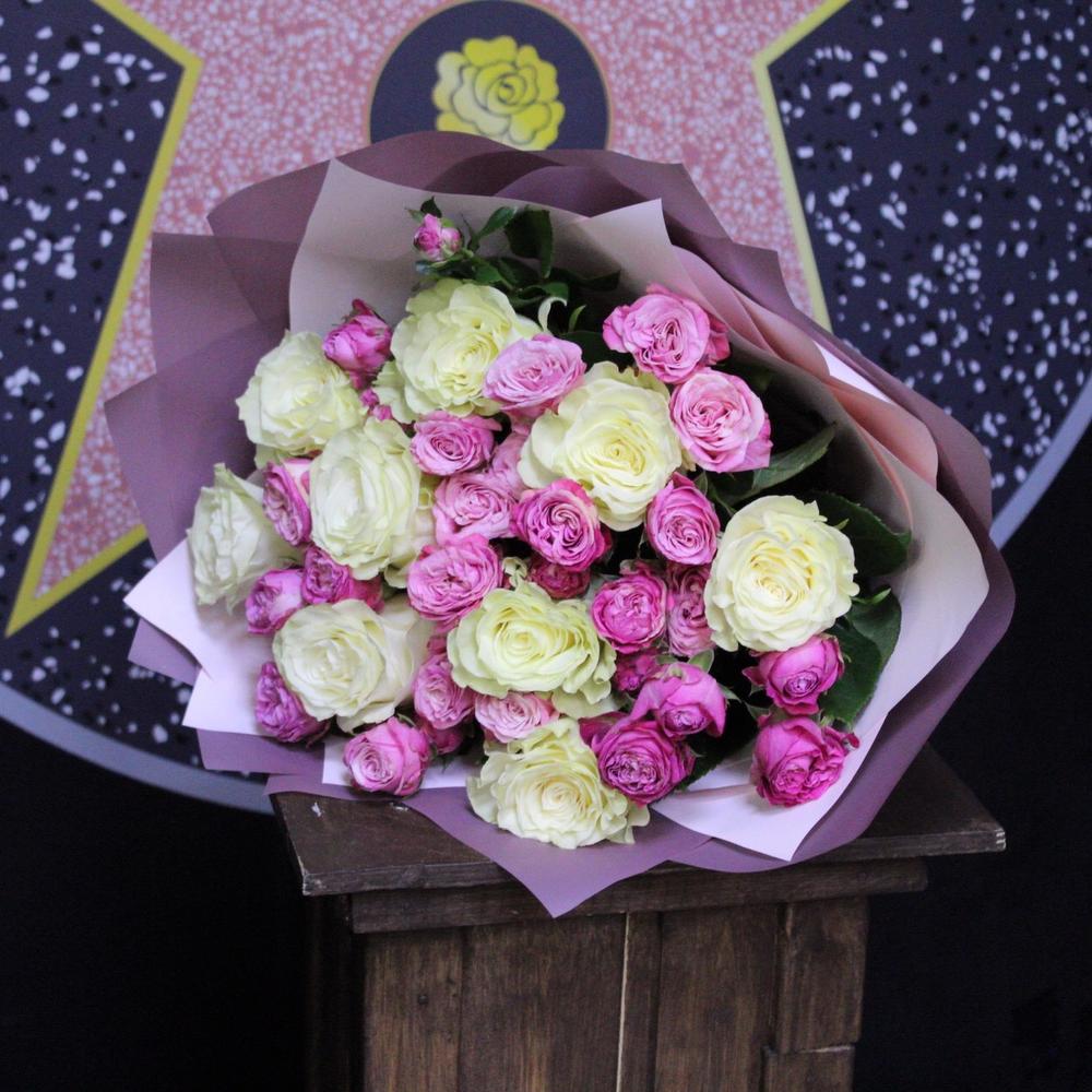Роза Мондиаль – 9 шт.роза кустовая пионовидная леди бомбастик – 6 шт.Пленка дизайнерская – 5 шт.Лента атласная – 1 шт.