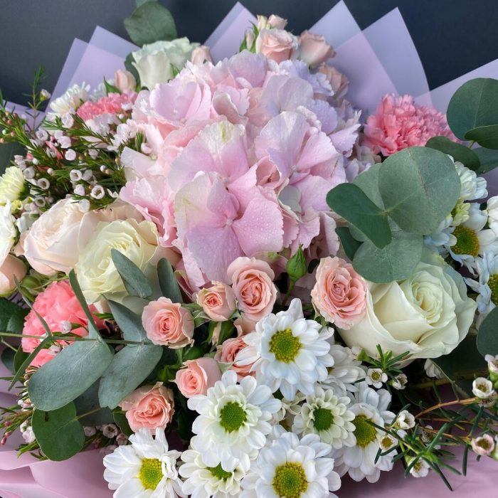 Гортензия розовая – 1 шт.Роза Эквадор – 3 шт.Роза кустовая – 3 шт.сантини ромашка кустовая – 4 шт.Диантус – 5 шт.Ваксфлауэр – 2 шт.Эвкалипт – 2 шт.зелень декоративная – 5 шт.Упаковка дизайнерская – 5 шт.