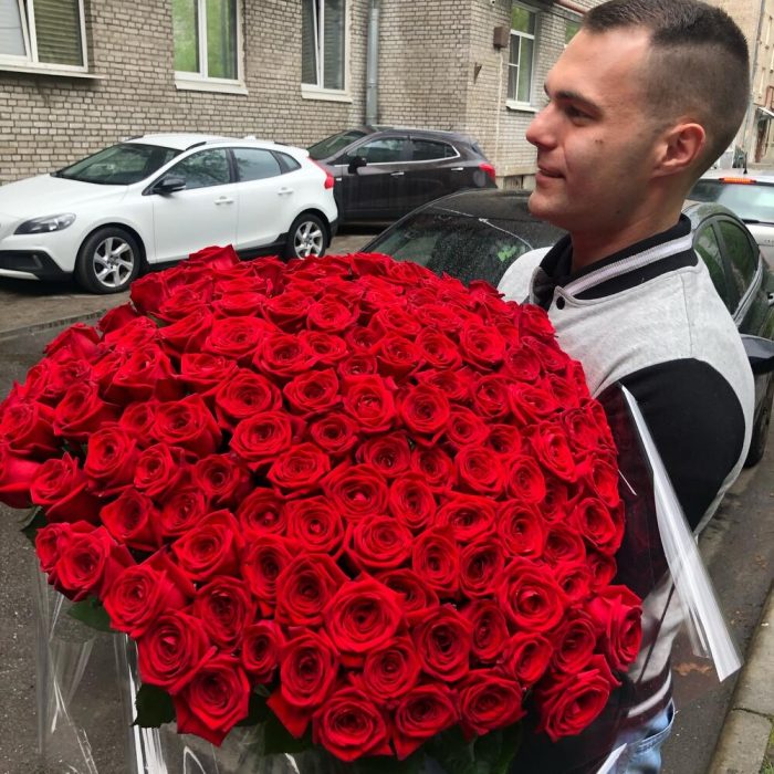 розы красные 70 см – 101 шт.Упаковка дизайнерская – 2 шт.Лента атласная – 1 шт.