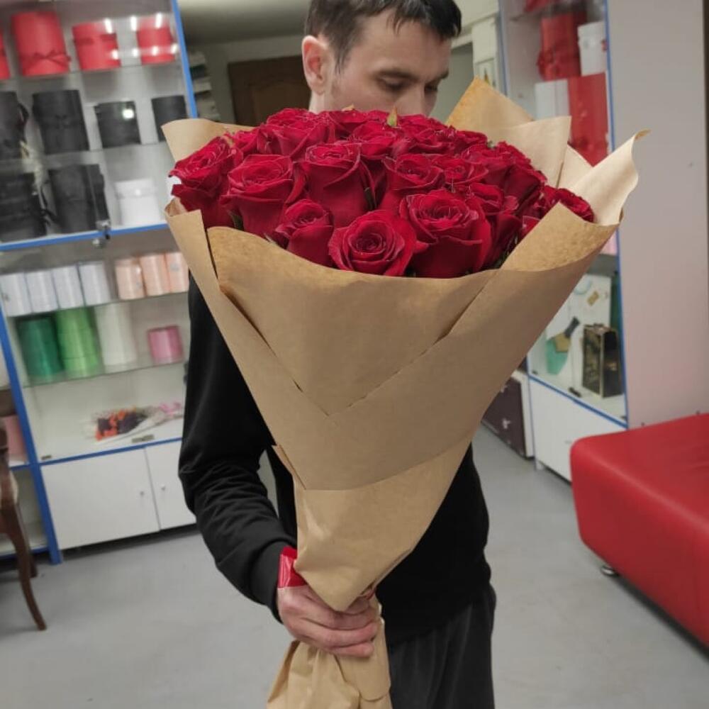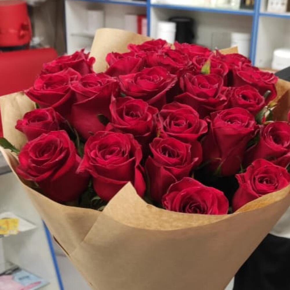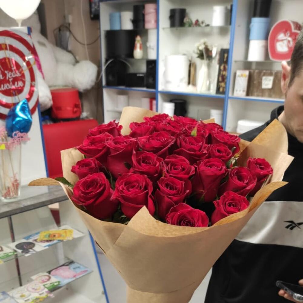 розы красные эквадор 70 см – 25 шт.Крафт дизайнерский – 2 шт.Лента – 1 шт.
