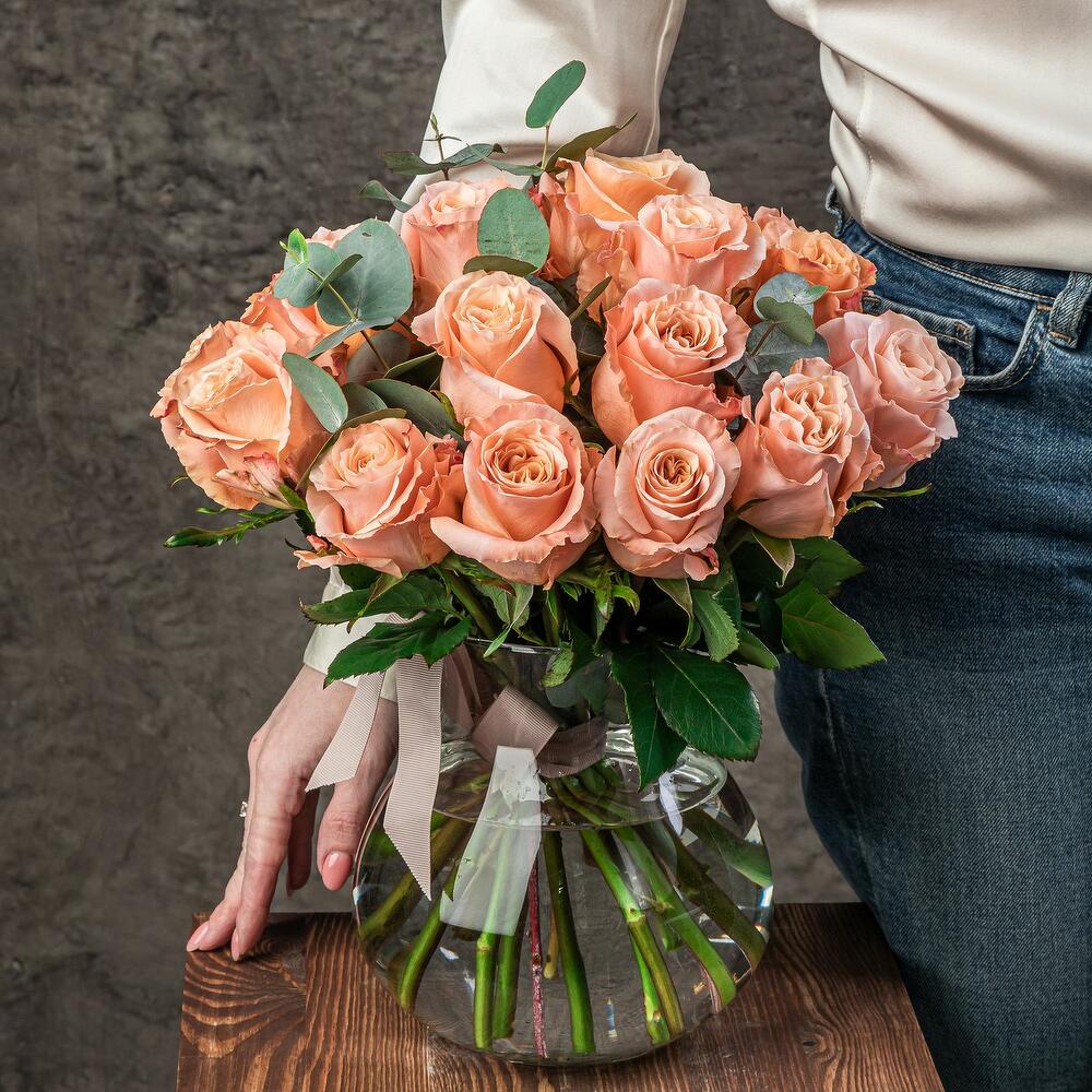 Оригинальная и удобная подача классического и элегантного монобукета из роз с ароматным эвкалиптом. Стойкий сорт розы, необычный персиковой-коралловый оттенок и свежий аромат эвкалипта создадут незабываемую атмосферу в любом месте: дом, офис, ресторан. Элегантная ваза-букетница … Показать ещёподойдет под любой букет или набор цветов в будущем.
