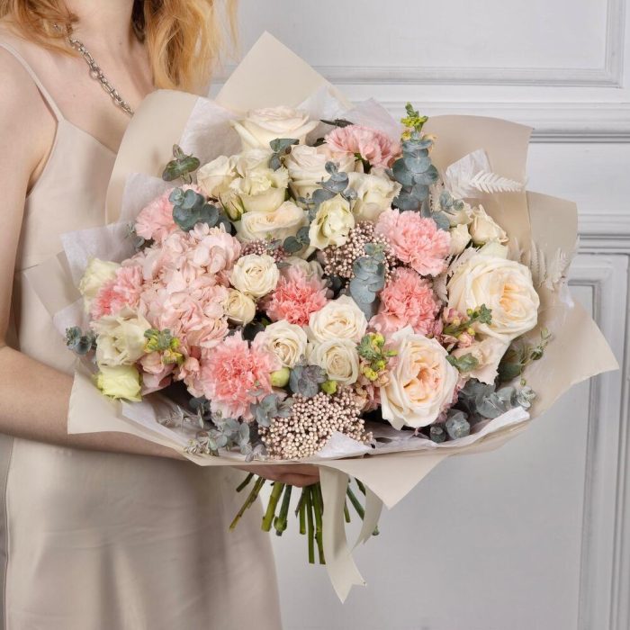 Гортензия – 1 шт.Эвкалипт – 5 шт.Маттиола – 7 шт.Эустома – 4 шт.Озотамнус – 3 шт.Диантус – 7 шт.Кустовая пионовидная роза – 5 шт.white o’hara – 5 шт.Упаковка дизайнерская – 2 шт.Писташ – 1 шт.Папоротник – 3 шт.