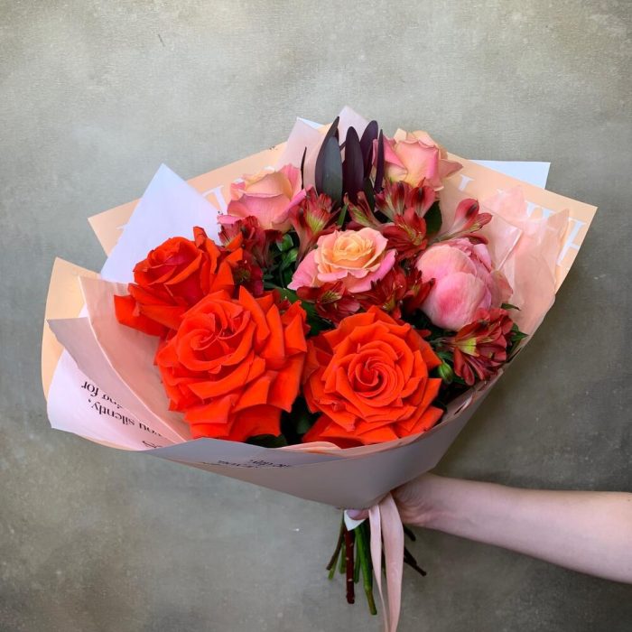 Роза французская – 3 шт.Роза – 3 шт.Альстромерия – 3 шт.Сафари – 1 шт.Пион – 1 шт.Упаковка – 2 шт.