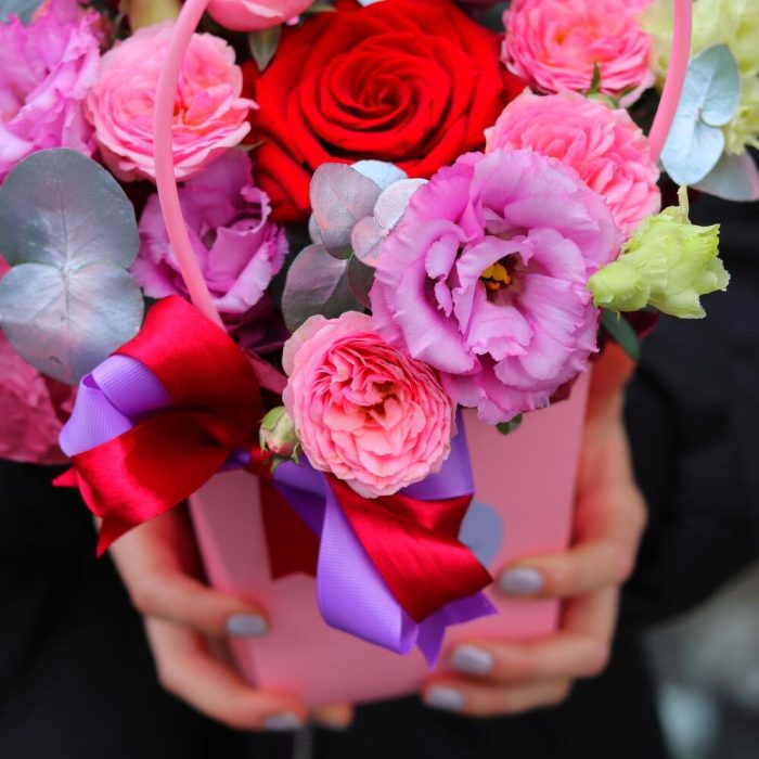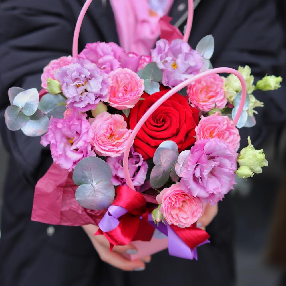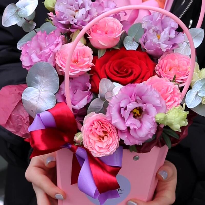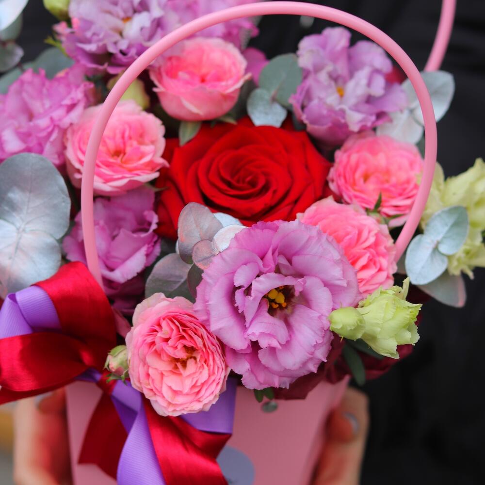 Яркий комплимент: яркие цветы в сумочке (лизиантус, красная роза, пионовидная кустовая роза”