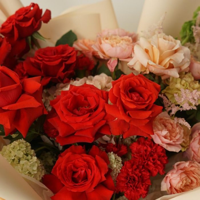 Роза французская – 10 шт.Роза кустовая джульетта – 2 шт.Астильба – 3 шт.Молюцелла – 2 шт.Гортензия – 1 шт.Диантус – 8 шт.Вибурнум – 2 шт.пампасная трава – 2 шт.Упаковка – 1 шт.