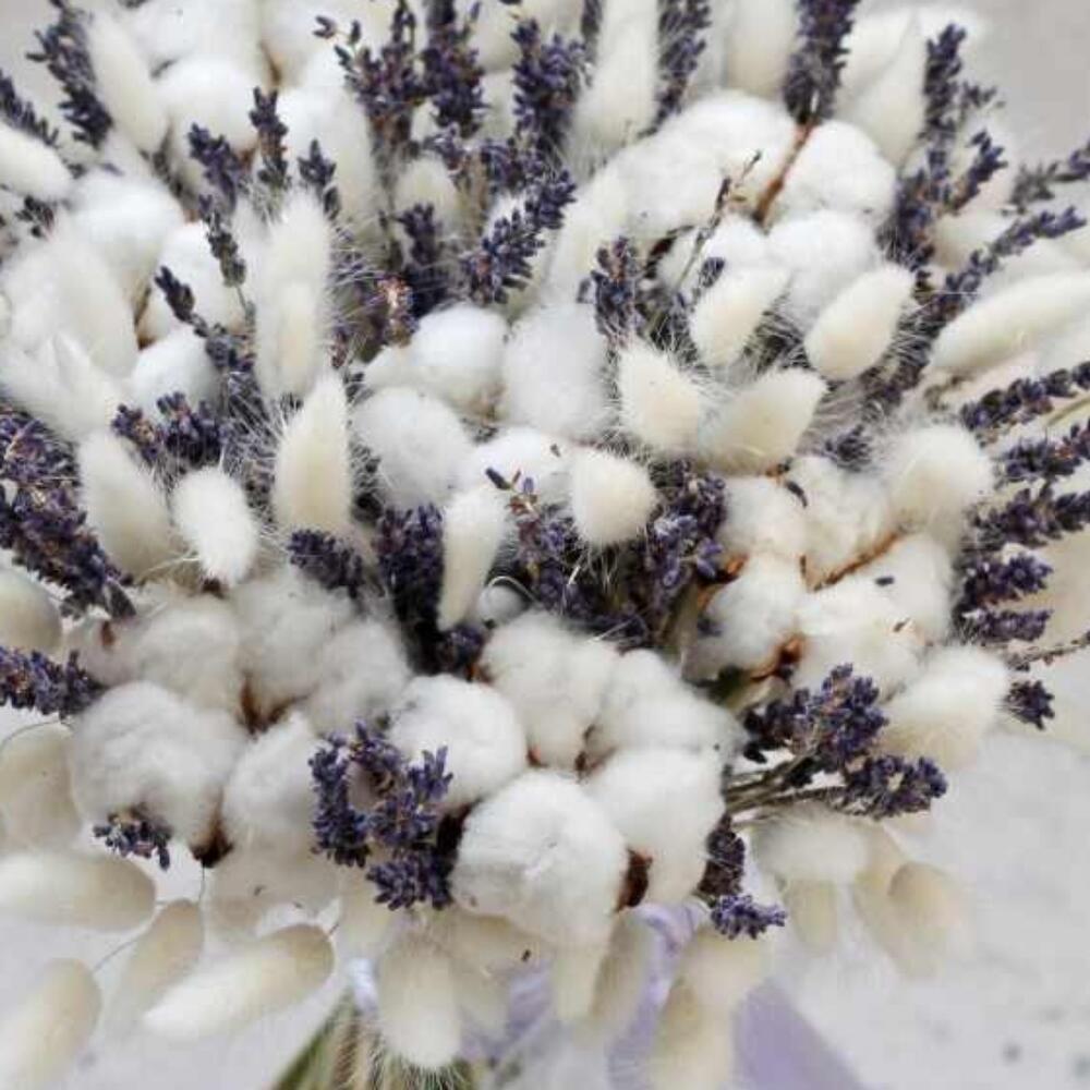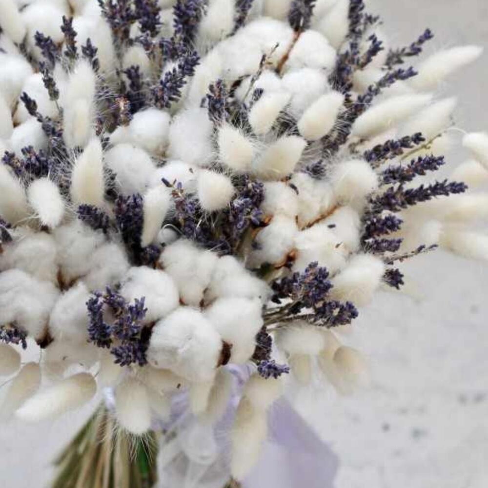 Хлопок – 6 шт.Лаванда – 45 шт.Лагурус – 51 шт.Лента атласная – 1 шт.