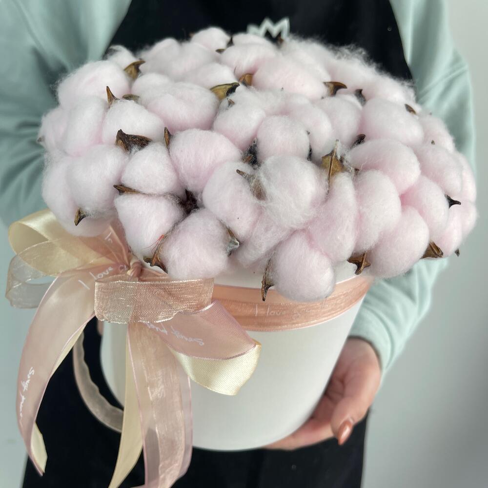 Хлопок – 21 шт.Коробка шляпная – 1 шт.Оазис флористический – 1 шт.